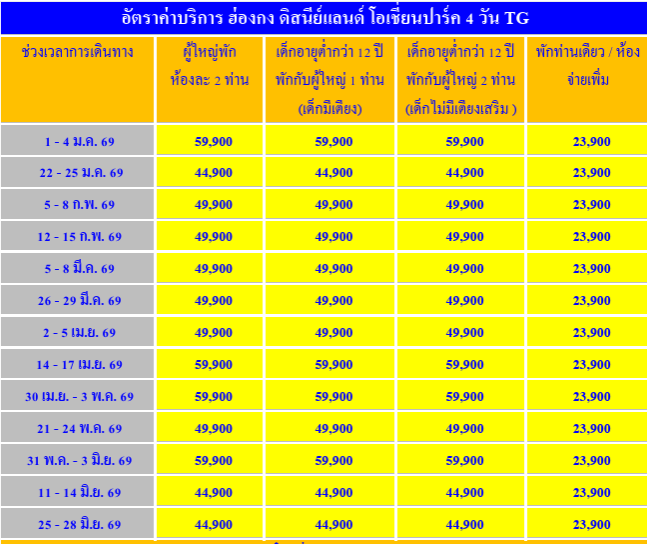 อัตราค่าบริการ ทัวร์ฮ่องกง - ดิสนีย์แลนด์ - โอเชี่ยน พาร์ค 4 วัน-TG