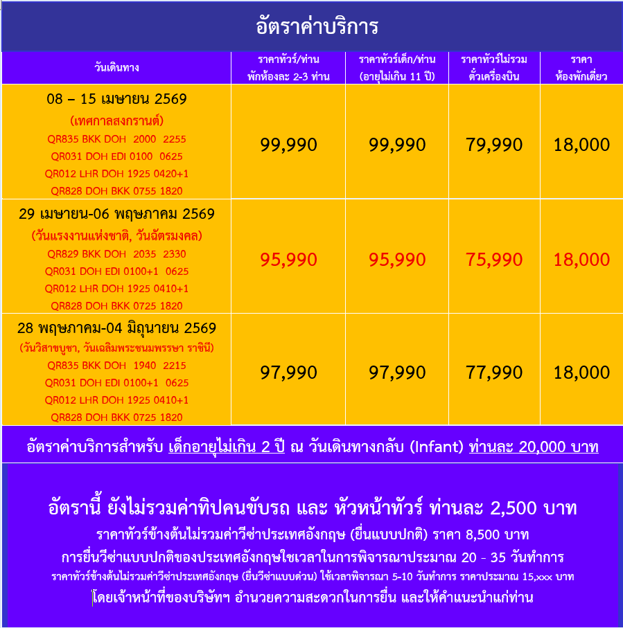 | วันที่ 8 | สนามบินฮาหมัด กรุงโดฮา ประเทศกาตาร์ – สนามบินสุวรรณภูมิ ประเทศไทย(-/-/-) |