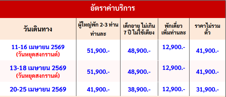 กำหนดวันเดินทาง : 11-16/13-18/20-25 เมษายน 2569