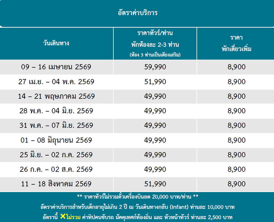 กำหนดวันเดินทาง :   เมษายน - สิงหาคม 2569