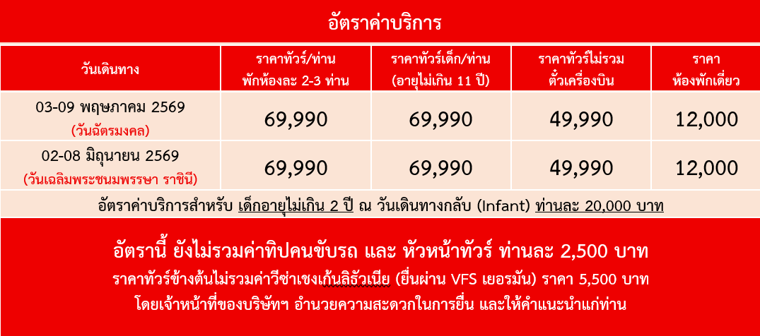 กำหนดวันเดินทาง :  03-09 พฤษภาคม / 02-08 มิถุนายน 2569