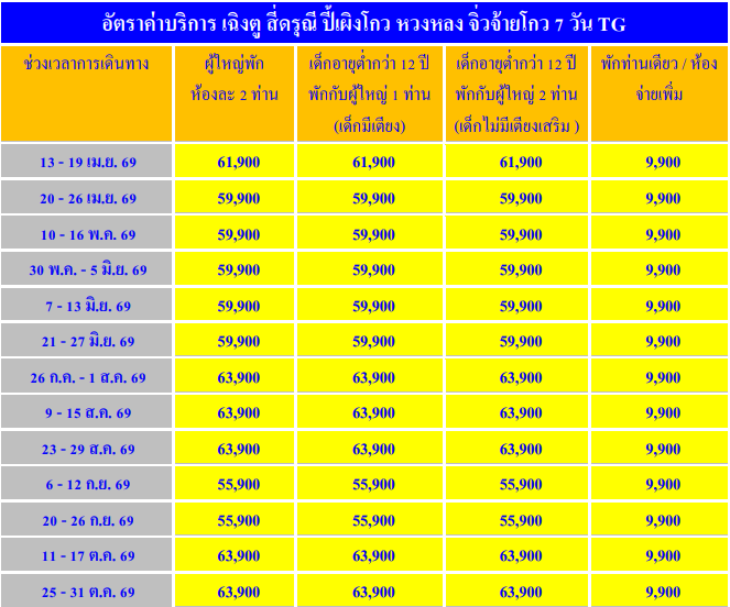 อัตราค่าบริการ ทัวร์จีน เฉิงตู – สี่ดรุณี – ปี้เผิงโกว – หวงหลง – จิ่วจ้ายโกว 7 วัน - TG