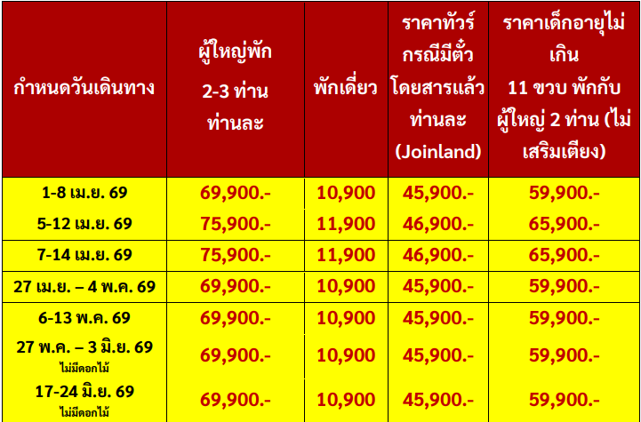 กำหนดวันเดินทาง :  เมษายน - มิถุนายน 2569