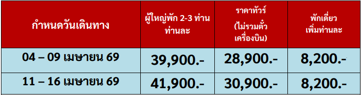 กำหนดวันเดินทาง :      04-09/11 - 16 เมษายน 2569