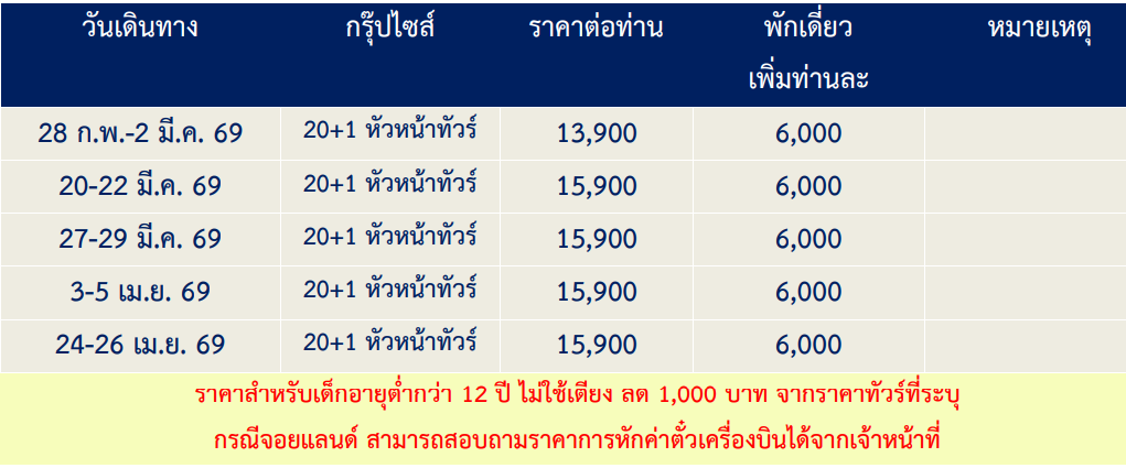 กำหนดวันเดินทาง :  กุมภาพันธ์ - เมษายน 2569
