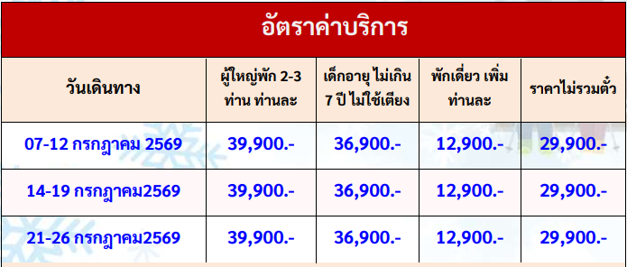 กำหนดวันเดินทาง : 07-12/ 14-19/ 21-26 กรกฏาคม 2569