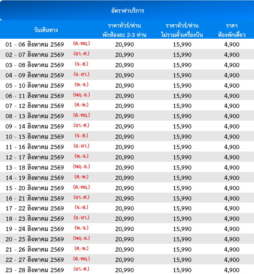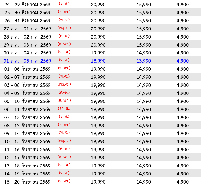 กำหนดวันเดินทาง :   สิงหาคม - ตุลาคม  2569