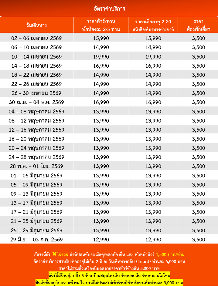 กำหนดวันเดินทาง :  เมษายน 2568 - มิถุนายน 2569
