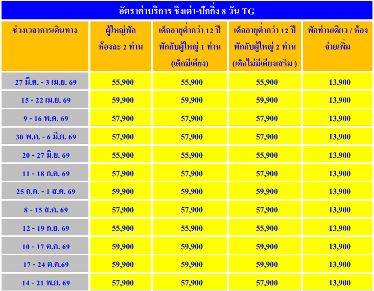 อัตราค่าบริการ    ทัวร์จีนชิงเต่า-ปักกิ่ง 8 วัน 7 คืน-TG