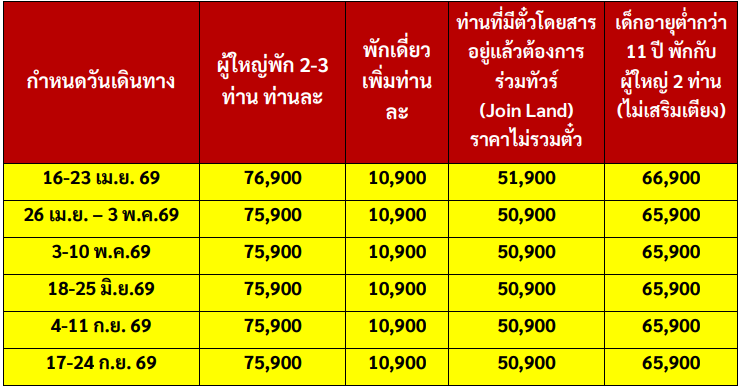 กำหนดวันเดินทาง : เมษายน - กันยายน 2569