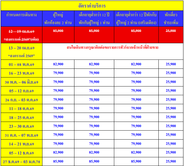 กำหนดวันเดินทาง : เมษายน - ธันวาคม 2569 (เทศกาลปีไหม่)