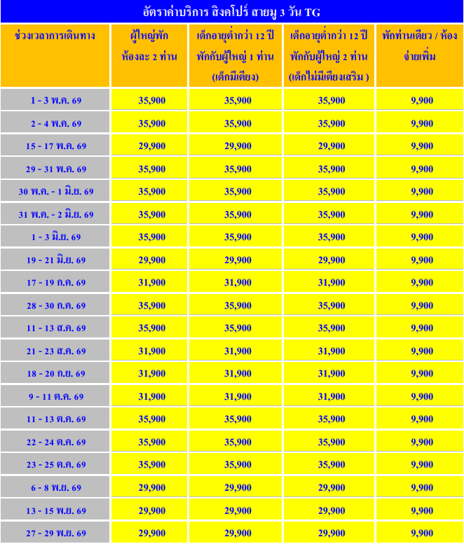 อัตราค่าบริการ ทัวร์สิงคโปร์ Blessing Seeker 3 วัน - TG
