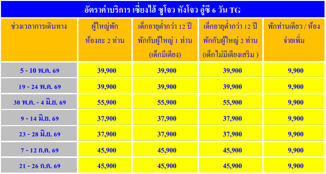 อัตราค่าบริการ ทัวร์พรีเมี่ยมเซี่ยงไฮ้ - ซูโจว - หังโจว - อู๋ซี 6 วัน - TG
