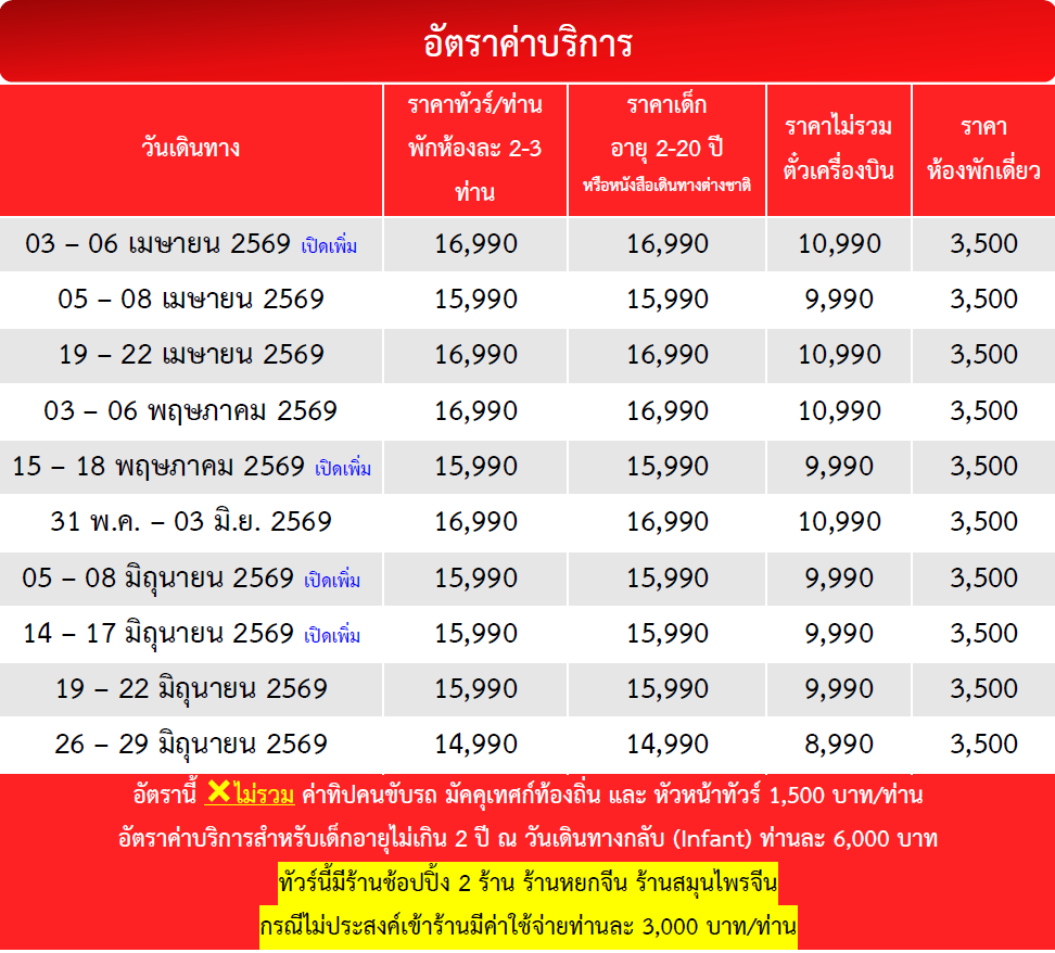 กำหนดวันเดินทาง :   เมษายน - มิถุนายน 2569