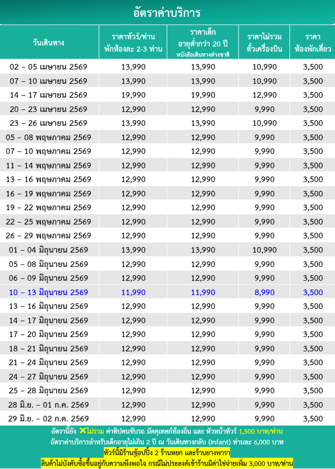 กำหนดวันเดินทาง :   เมษายน - มิถุนายน 2569