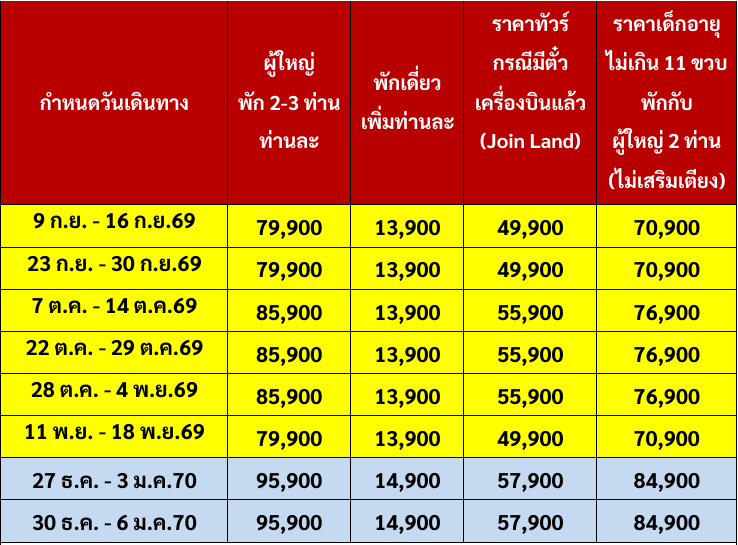 กำหนดวันเดินทาง :  กันยายน - ธันวาคม 2569 (เทศกาลปีใหม่)