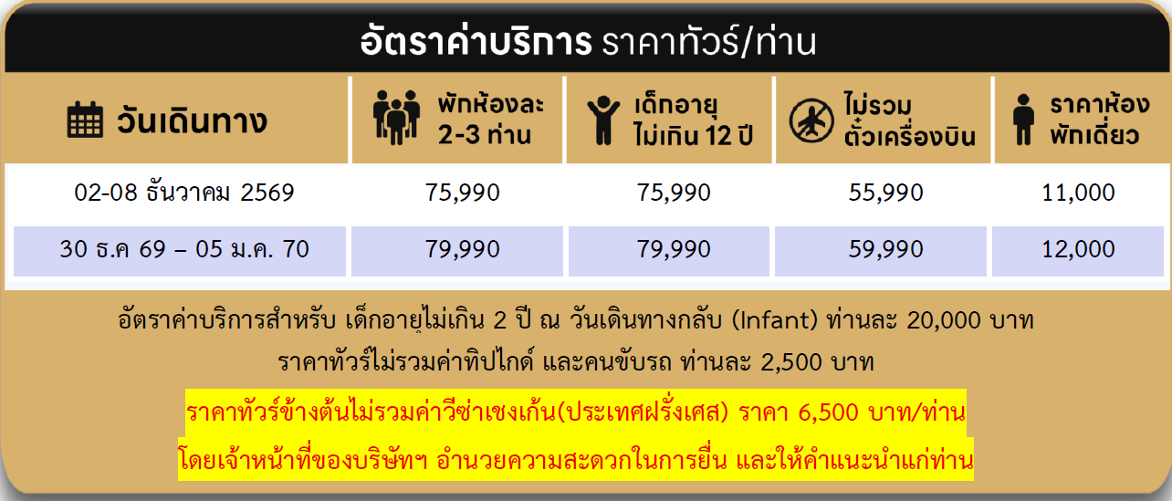 กำหนดวันเดินทาง : 02 – 08 ธ.ค 2569 ; 30 ธ.ค. 2569 – 05 ม.ค. 2570