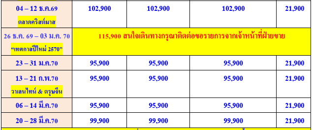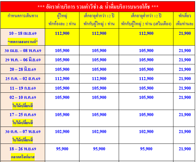กำหนดวันเดินทาง : เมษายน 2569 (เทศกาลปีใหม่)- มีนาคม 2570