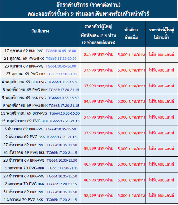 อัตราค่าบริการ      ทัวร์คุณธรรม เซี่ยงไฮ้ นานกิง หนิวโส่วซาน 5 วัน 4 คืน-TG