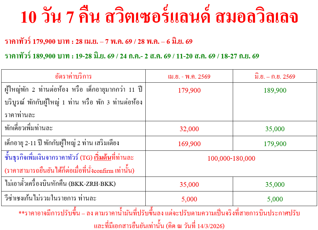 อัตราค่าบริการ  10 วัน 7 คืน สวิตเซอร์แลนด์ สมอลวิลเลจ-TG