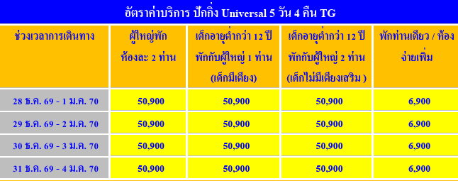 อัตราค่าบริการ      ทัวร์จีน ปักกิ่ง สวนสนุก UNIVERSAL 5 วัน - TG