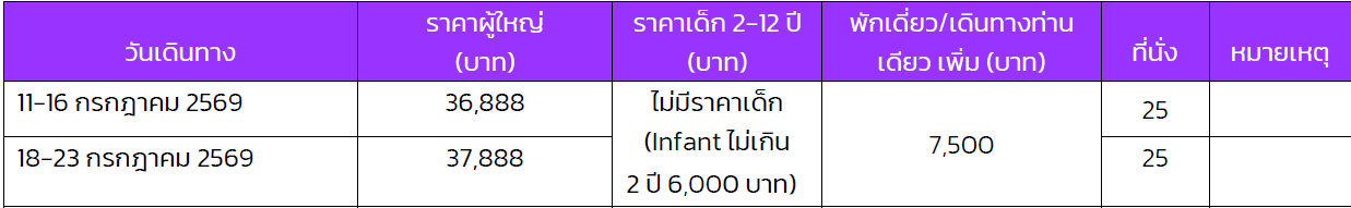 กำหนดวันเดินทาง : 11 - 16 กรกฎาคม ; 18 - 23 กรกฎาคม 2569