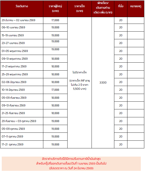 กำหนดวันเดินทาง : เมษายน - ตุลาคม 2569